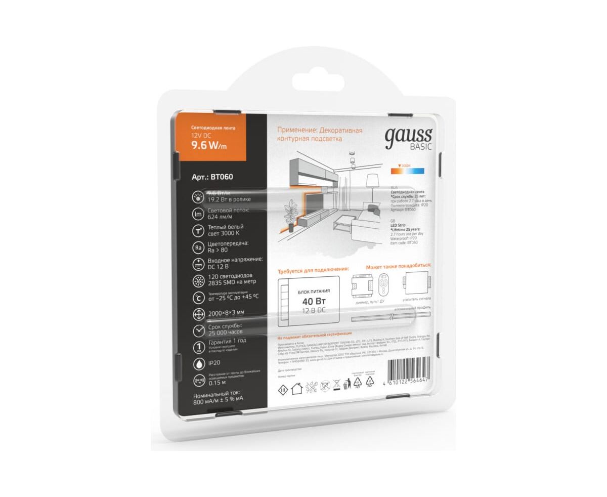 Лента Gauss Basic 12V 9,6W/m 624lm/m 3000K IP20 LED 2m BT060 способна решить ряд задач связанных как с декоративным освещением помещений, так и с экстерьерной подсветкой.