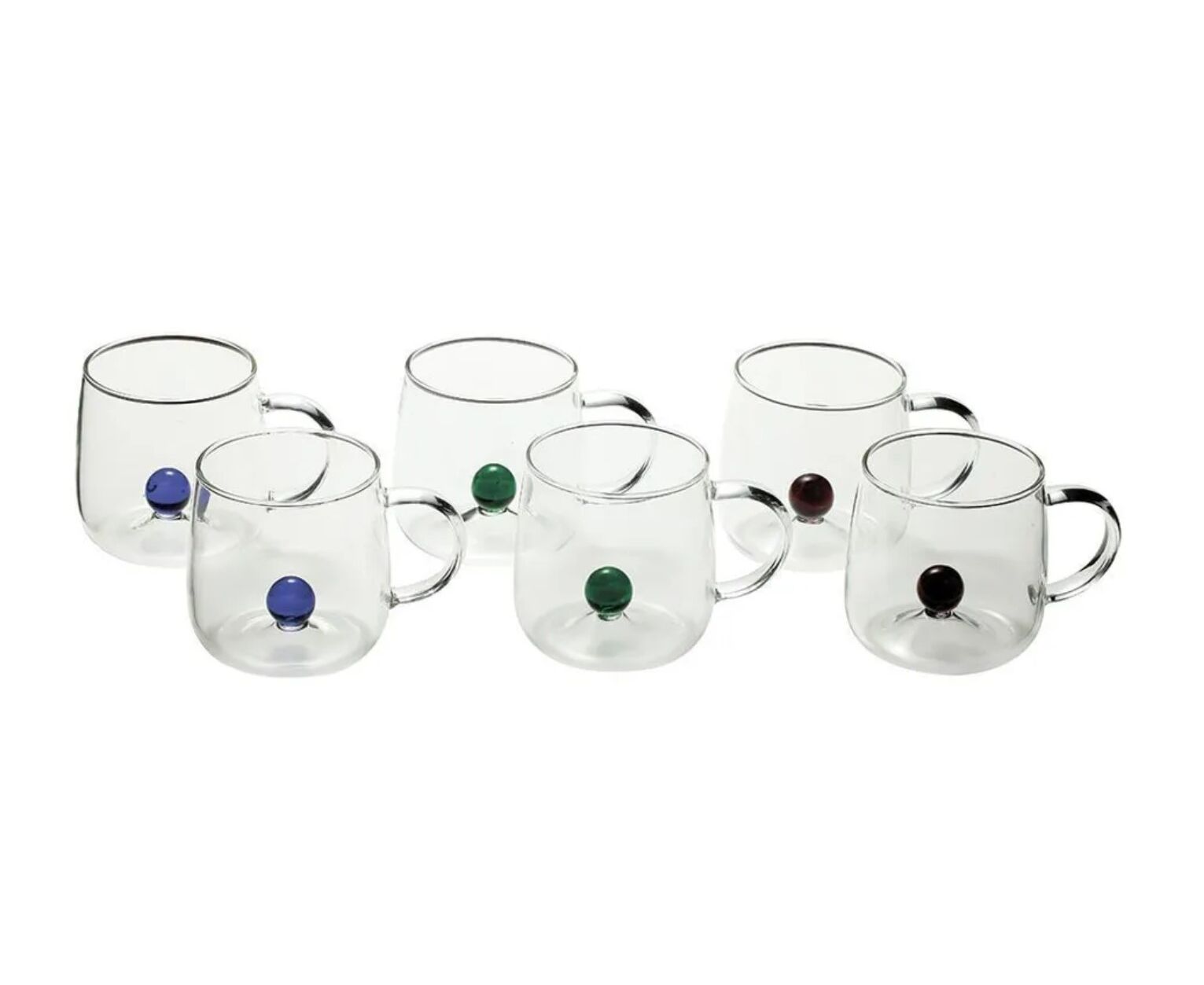 Набор кружек 6 предметов, 250 мл, корпус из термостойкого боросиликатного стекла, декоративный элемент из цветного стекла на дне, подарочная упаковка.