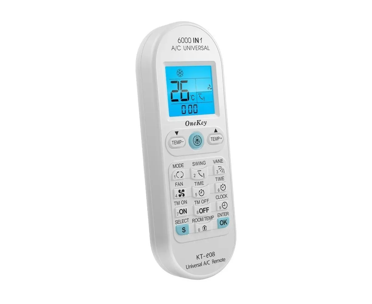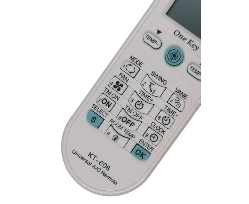 Универсальный специализированный пульт KT-E08 предназначен для управления кондиционерами с 6000 кодами, подходит для многих мировых брендов, старых и новых моделей. Пульт имеет жидкокристаллический дисплей, часы с таймером включения и выключения, отображение температуры в комнате и т.д.