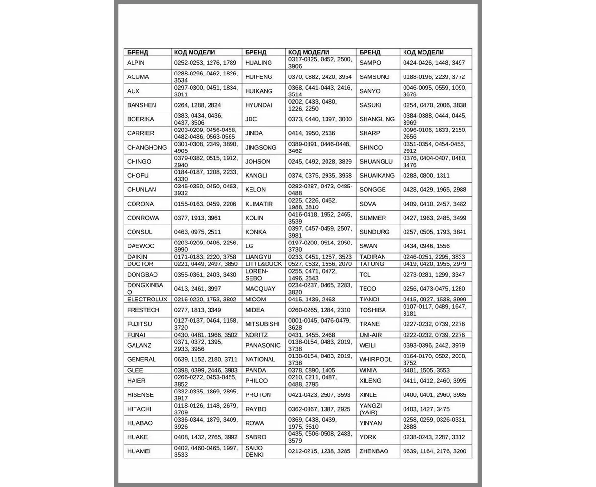 1. Найдите коды в таблице кодов, в которой сгруппированы коды моделей различных брендов. Выберите название своего бренда и введите первое четырехзначное число из представленных кодов в данной группе. Если первый код не подошел, попробуйте следующий, и делайте перебор кодов из таблицы до тех пор, пока не сможете управлять своим кондиционером. Например, для марки SAMSUNG попробуйте код «0188», если он не подошел, то «0189», и так далее.